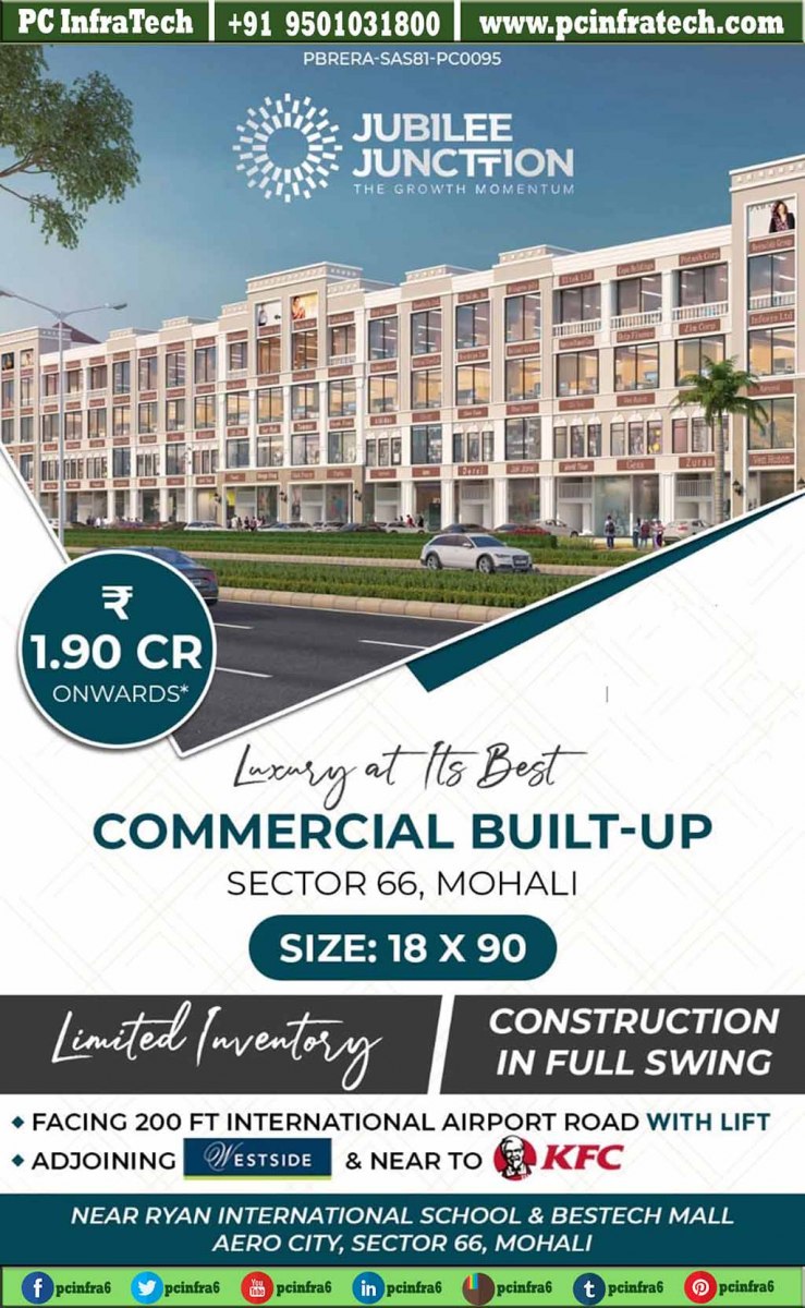 Jubilee Junction is the 3rd Commercial Project of Jubilee Group on the International Airport Road of 3.66 Acres in Sec-66 of Mohali. SCO Sites with FAR-3 wherein Basement, Ground+3 Floors can be Constructed.